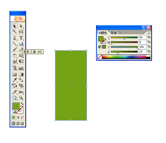 學承電腦補習班[Illustrator教學示範] 快速畫出插花的花瓶 <!--[if !supportLists]-->1. <!--[endif]-->先用[矩形工具]畫出一個長方型,然後<填色>C50 Y100 K25,<筆畫>不填色。 點我查看完整教學示範